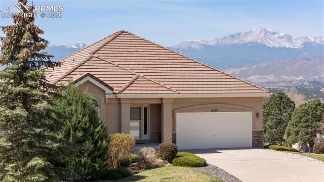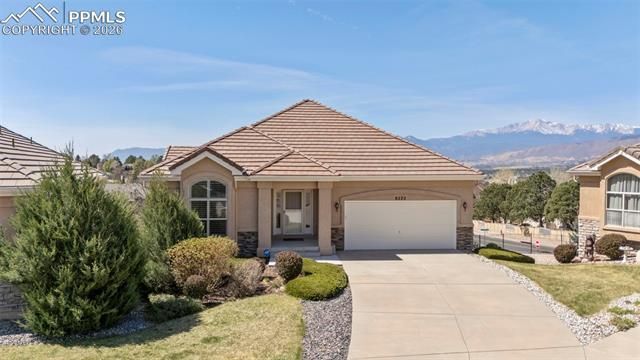 Ease of living and sweeping Pikes Peak views merge together in this special home, tucked away in a cozy, tightknit neighborhood in a great, central location. Freshly refinished hardwood flooring flows smoothly in from the front door, leading to the beautifully upgraded gourmet kitchen with high-grade granite countertops, refinished cabinetry, subway tile backsplash and newer stainless steel appliances including gas cooktop, double ovens and refrigerator. The stunning views of Pikes Peak can be enjoyed from so many places on this property, including a first glimpse as you make your way up the driveway, from the dining room, covered deck, master bedroom, family room and wet bar area, patio and from bedroom #3. The master bedroom also boasts vaulted ceilings, plantation shutters, walkout to the deck, adjoining bath and 8x8 walk-in closet. The 5-piece bath includes double vanities, a nice-sized shower with bench, soaking tub, and a linen closet. On the main level, you will also find a second bedroom with plantation shutters, and a 3/4 hall bath with tile floor & countertop. Plus, a main level laundry, complete with washer, dryer, utility sink and tons of storage cabinets. Head downstairs to enjoy entertaining in the spacious Family Room with walkout to patio, garden level windows and bonus wet bar area with space for a gaming table or extra wet bar seating. Two additional spacious bedrooms, both with garden level windows, a full hall bath, and a large 12x10 storage room round out the basement. Additional features of this home include an extra-deep garage (measuring approx. 23’8” x 19’11”), central air conditioning, a newer furnace (2023), newer water heater (2021), low-maintenance tile roof and stucco siding, and nearly 9-foot ceilings in basement. HOA-maintained landscaping makes this home an excellent choice for anyone who doesn’t want to spend their days taking care of a yard. This home has been extremely well-kept and will please even the most discerning buyer.
